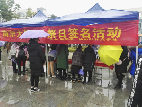 今年是南京大屠殺七十九周年,為了銘記國恥,培養學生的愛國主義情感,12月13日,在我國第三個南京大屠殺死難者國家公祭日到來之際,我院組織開展了以“勿忘國恥,愛我中華”為主題的南京大屠殺死難者國家公祭日簽名活動。學院的同學們積極參與這一活動,用簽名的形式表達自己的愛國情感。